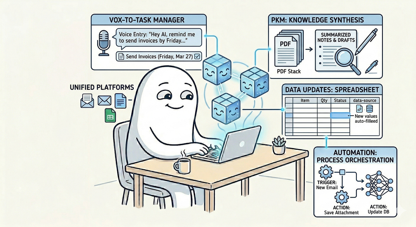 Up to this point in this series, I have written about several distinct ways AI is already changing personal productivity. I discussed AI as an assistant that helps reduce administrative friction and shadow work. I explored AI as an assistant, researcher, learning partner, and coach. Then I looked at how AI is being embedded inside the tools we already use, and how AI coding companions are lowering the barrier to building bespoke tools and workflows for ourselves. The next question is what happens when all of those capabilities begin to accumulate around us. What happens when you are not using one AI tool, but many? What happens when one system is helping you research, another is helping you write, another is building slides, another is generating diagrams, another is producing audio, and yet another is browsing the web or carrying out multi-step digital tasks on your behalf?